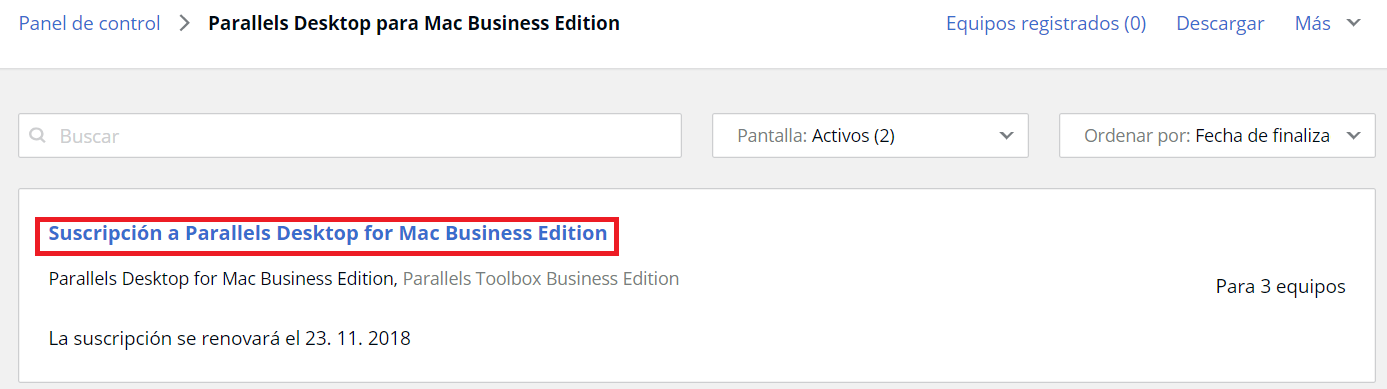 1. Inicie sesión en su cuenta Parallels. Las suscripciones en el panel se dividen por producto. Haga clic en Suscripciones activas debajo de cualquiera de los productos para ver la lista de suscripciones.