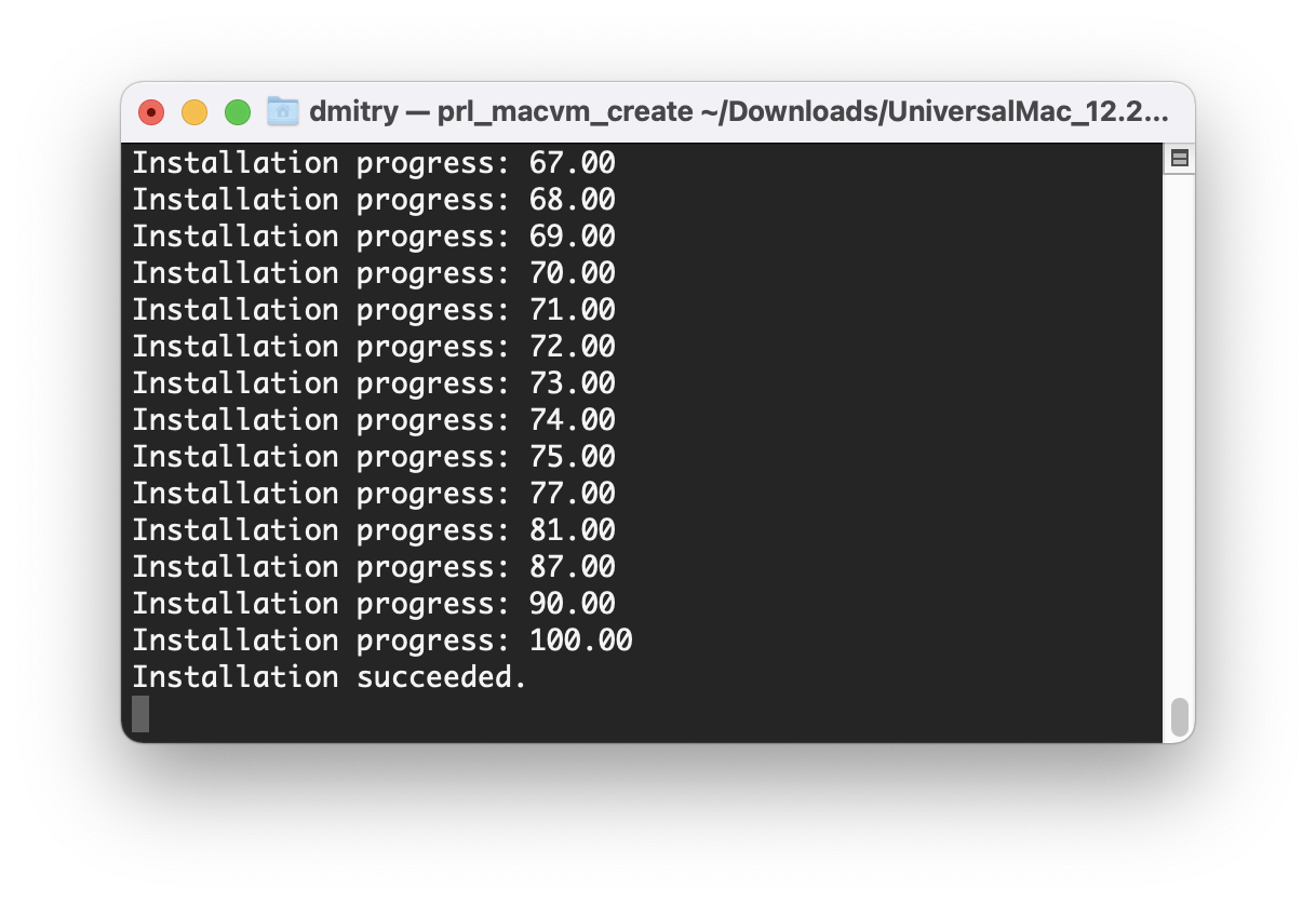 Nota: El tamaño del disco duro de la máquina virtual macOS ARM solo se puede configurar una vez en el momento de la creación. Actualmente no hay forma de cambiarlo después. Este comando indica la capacidad de almacenamiento en bytes. Dado que Apple utiliza el sistema decimal para medir la capacidad de almacenamiento, 80.000.000.000 bytes en este ejemplo equivalen a 80 gigabytes./Applications/Parallels\ Desktop.app/Contents/MacOS/prl_macvm_create ~/Downloads/UniversalMac_13.3_22E252_Restore.ipsw ~/Parallels/macOS.macvm --disksize 80000000000