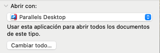 Nota : el archivo .ipsw debe configurarse para que lo abra la aplicación Parallels Desktop. Para ello, simplemente haga clic derecho en el archivo .ipsw > Obtener información > en la sección 'Abrir con' seleccione Parallels Desktop y haga clic en Cambiar todo.