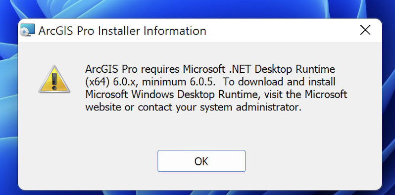 Hemos observado que algunos de ustedes se encuentran con un mensaje de error al iniciar ArcGIS Pro que les pide que descarguen e instalen el marco Microsoft .NET Desktop Runtime x64.