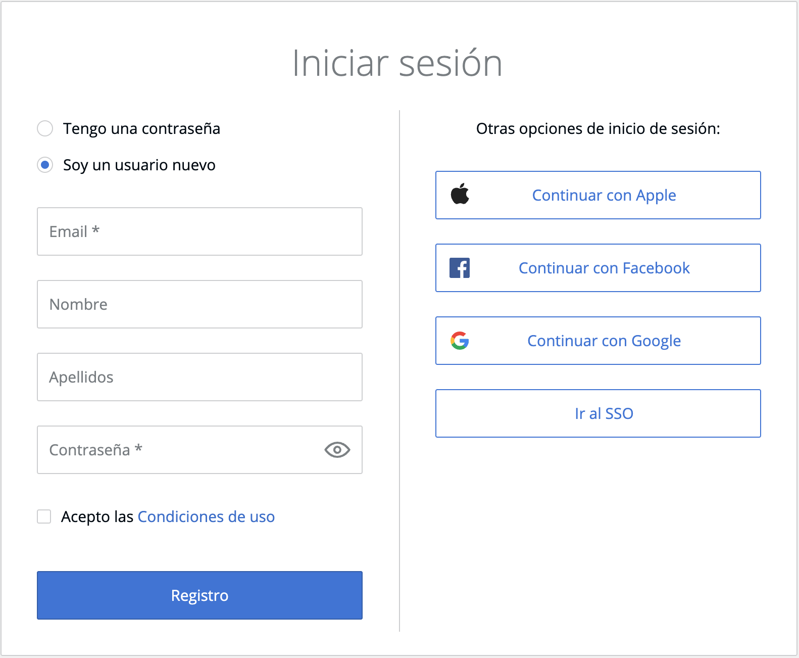 - Introduzca su nombre y contraseña, acepte las Condiciones de uso y haga clic en Registro