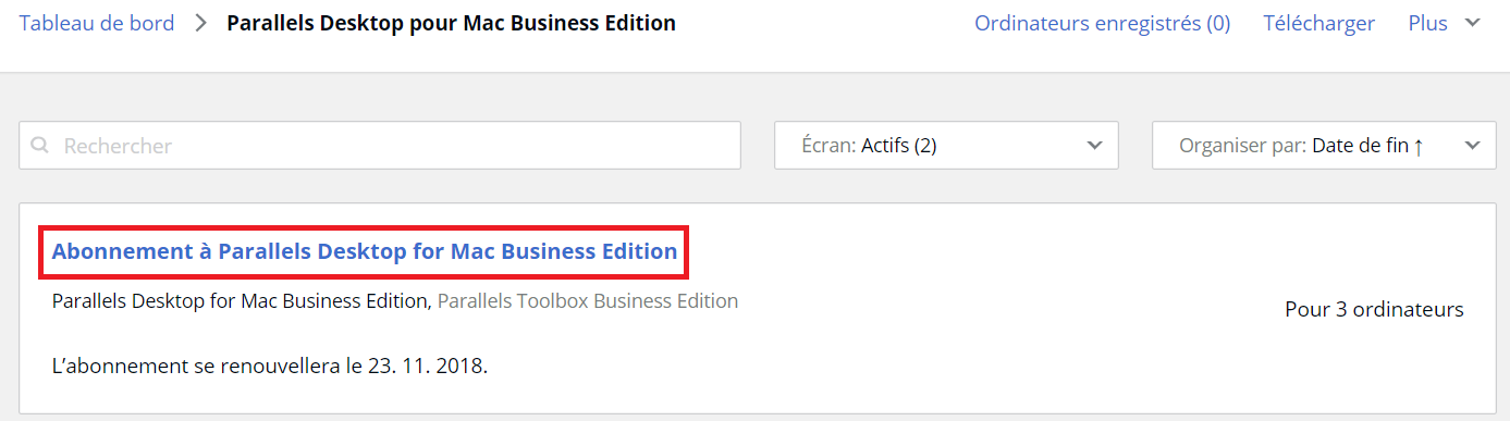1. Connectez-vous à votre compte Parallels. Dans le tableau de bord, les abonnements sont divisés par produit. Cliquez sur Abonnements actifs en dessous de l'un des produits afin d'afficher la liste des abonnements.
