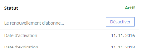 3. La propriété Renouvellement d'abonnement comporte une zone de statut. L'option Actif indique que le renouvellement automatique d'un abonnement est activé et l'option Inactif indique qu'il est désactivé.