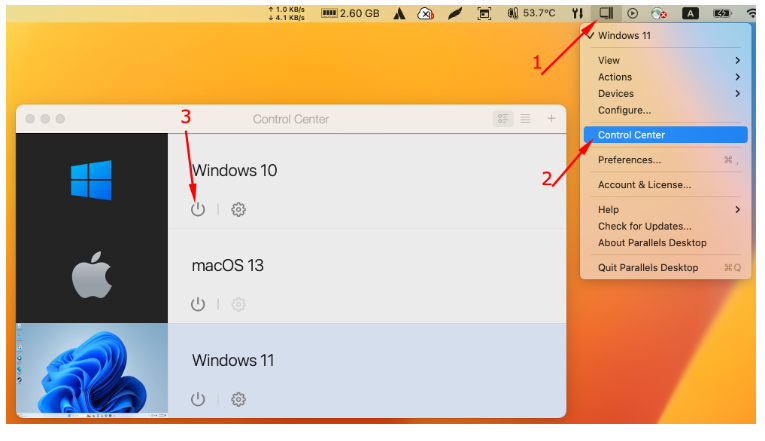 1.啓動您的Windows 10虛擬機(Parallels圖標>控制中心>點擊虛擬機的名稱)。