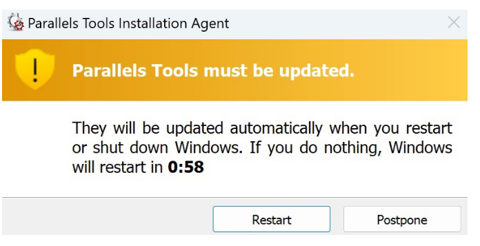 10.一旦Windows 11虛擬機重啓,您將收到重新安裝 Parallels Tools提示。只需點擊重啓即可更新 Parallels Tools。