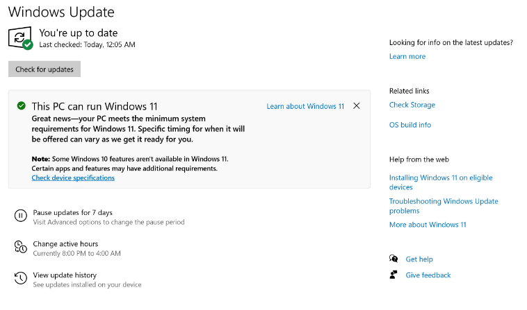 4.一旦TPM被啓用,進入 "開始 "菜單>點擊設置>更新和安全。您就會見到信息提示為此電腦可以運行Windows 11(如果沒有提示,只需等待10-15分鐘並重複此步驟)。