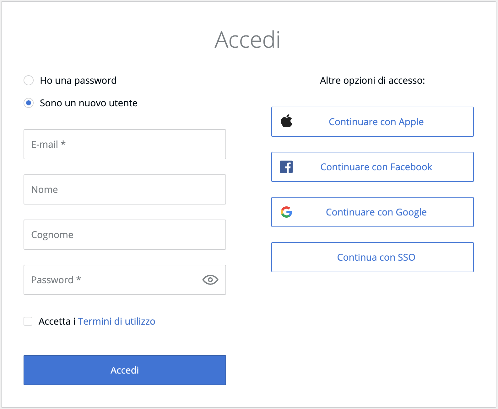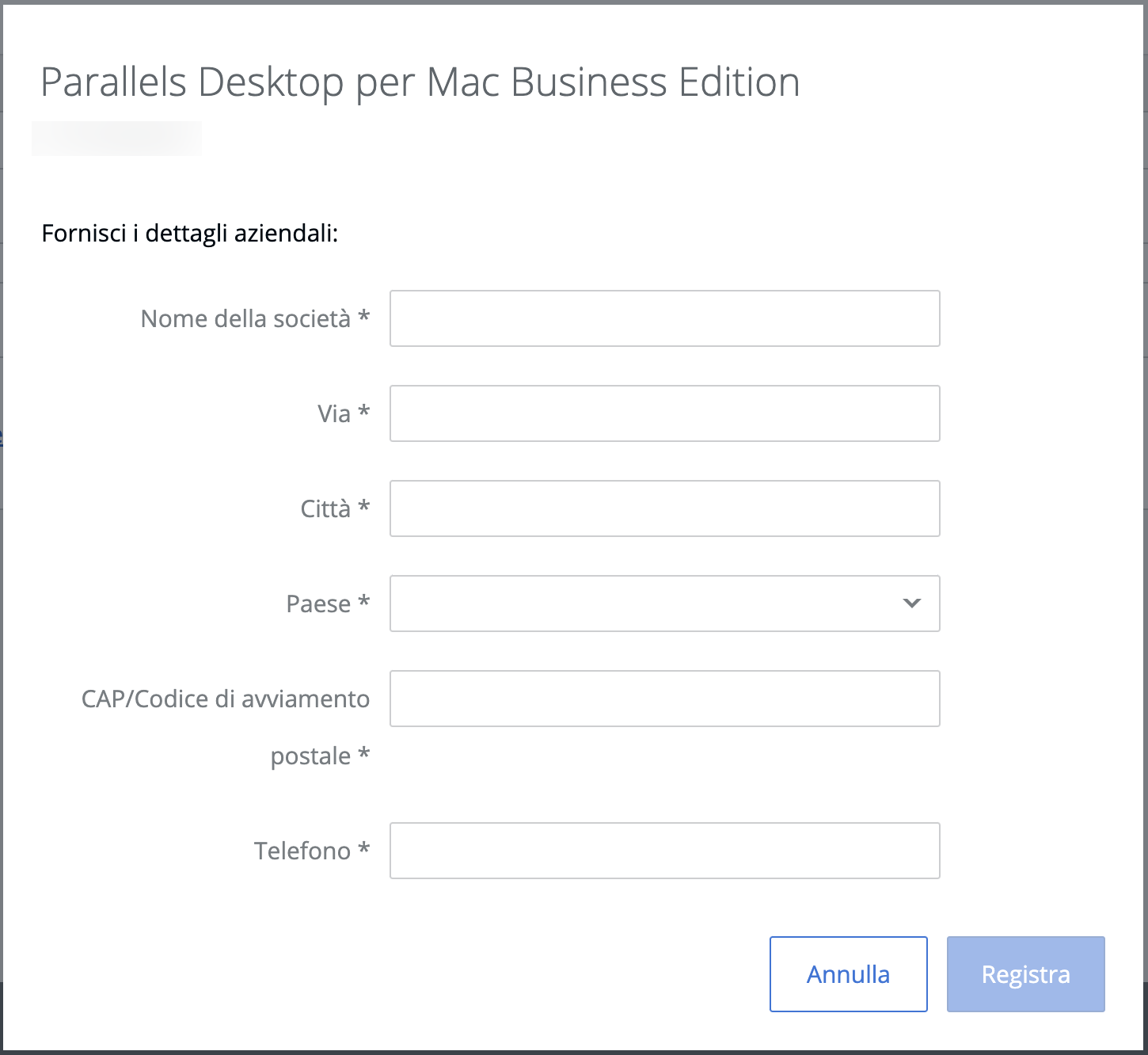Quando si avviano alcune applicazioni Parallels per la prima volta, viene visualizzata una finestra di accesso. Si hanno inoltre a disposizione due opzioni: accedere con un account esistente o crearne uno nuovo. Selezionare l’opzione che consente di registrare un nuovo account, compilare il modulo relativo alle informazioni di contatto e attenersi alle istruzioni visualizzate sullo schermo.