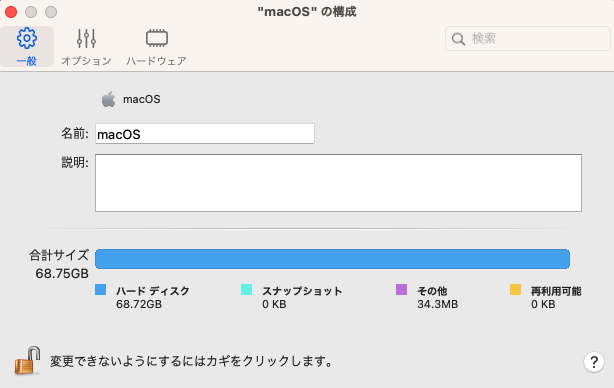 注: macOS Arm VM のディスクサイズはデフォルトで 60 GB です。Parallels Desktop 18 以降では、手動インストールプロセスで別の値に設定することができ、Parallels Desktop 19 では設定インタフェースまたはコマンドラインオプションを使用してサイズを変更することもできます。