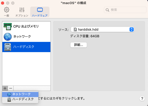 - ネットワークモード(共有/ブリッジ)およびネットワークアダプタのMACアドレス
