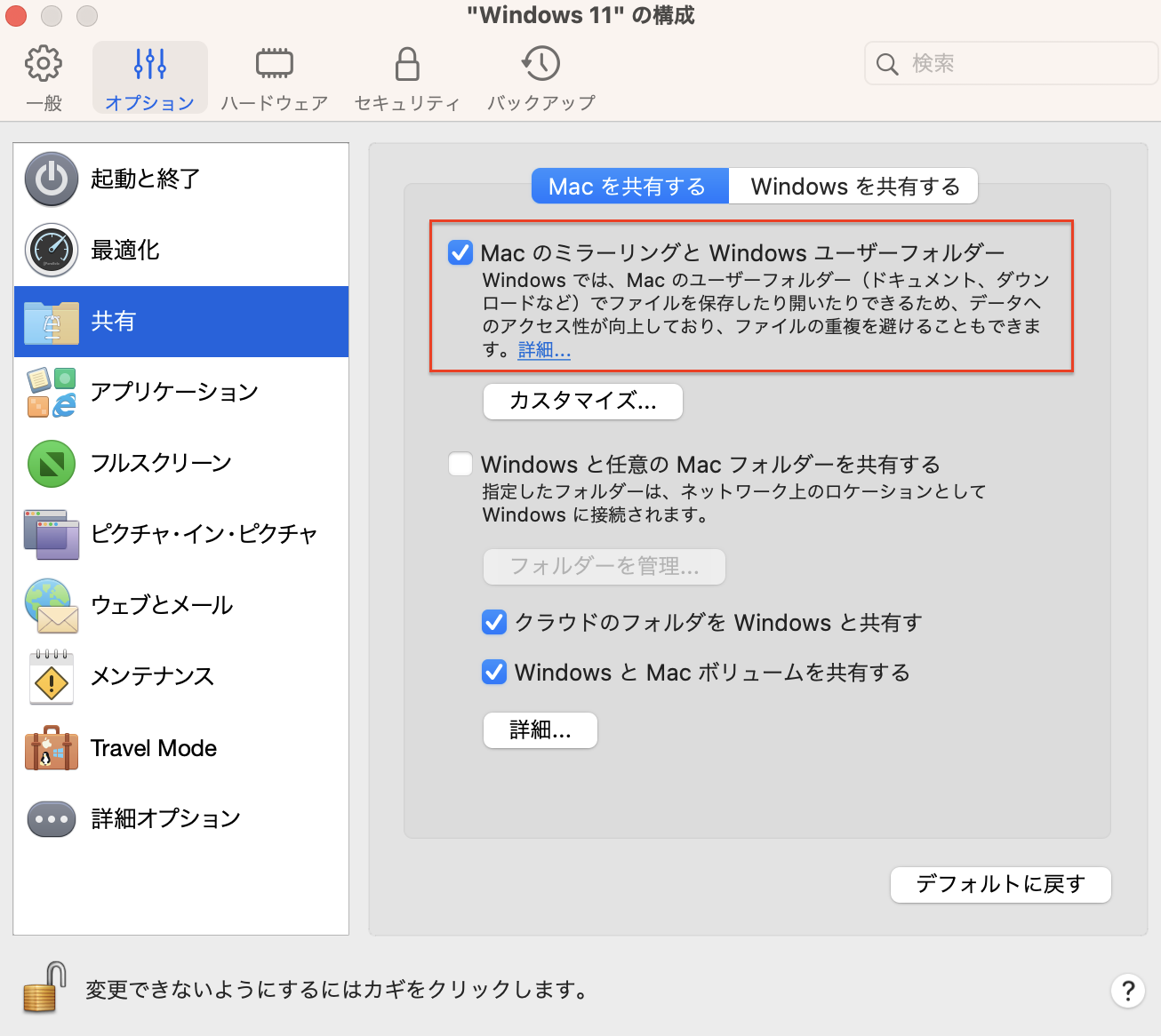 共有プロファイル機能を使用すると 、Windows VM 内から Mac 上のファイルやフォルダにアクセスできます。設定は、VM 構成 > オプション > 共有 > Mac および Windows ユーザー フォルダのミラーリングで制御できます。