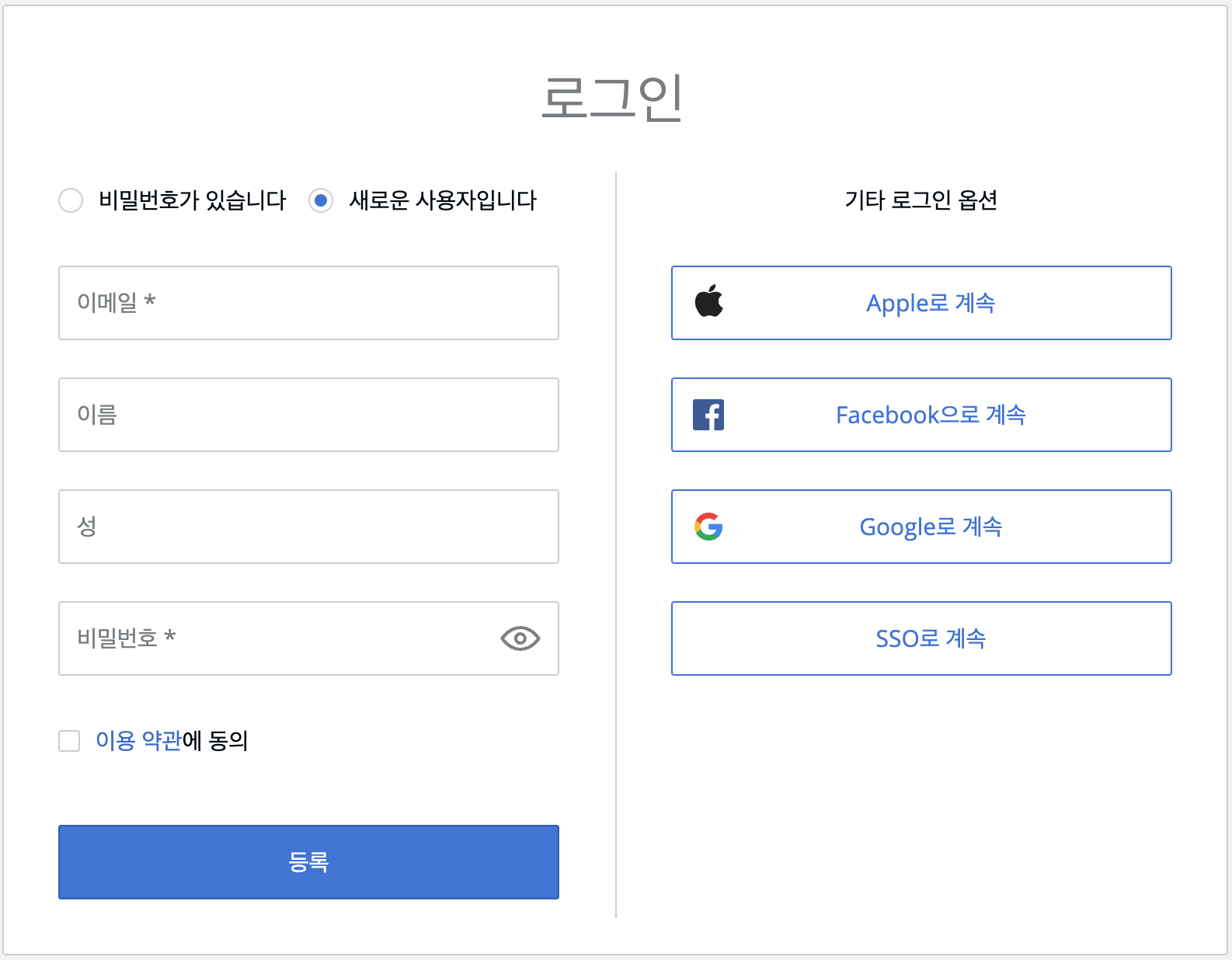 - 이메일 주소, 이름, 비밀번호 입력 및 이용 약관 체크 후 등록 클릭
