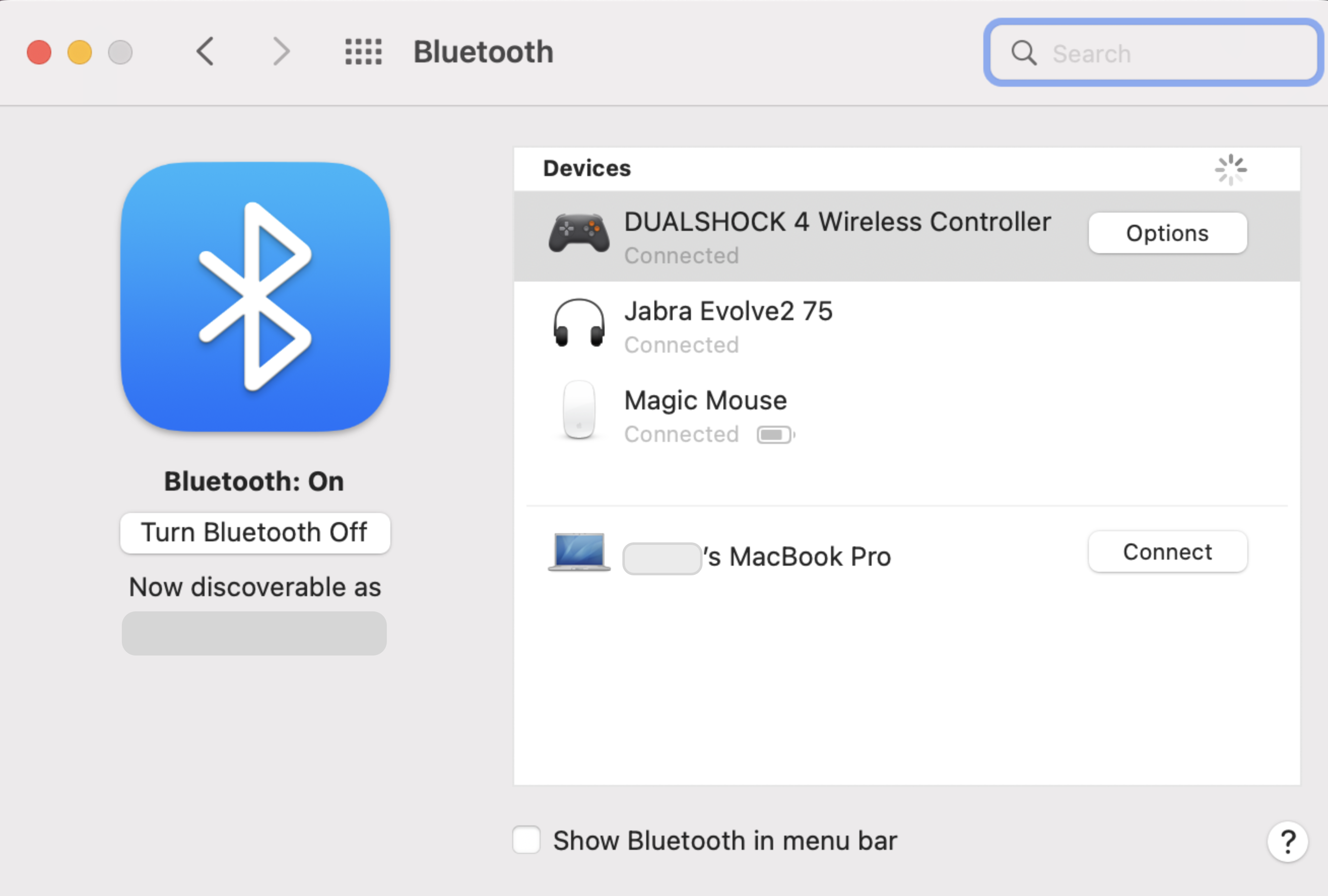 1. Подключите контроллер к компьютеру Mac. Он должен появиться в списке устройств со статусом Подключено (раздел Системные настройки > Bluetooth).