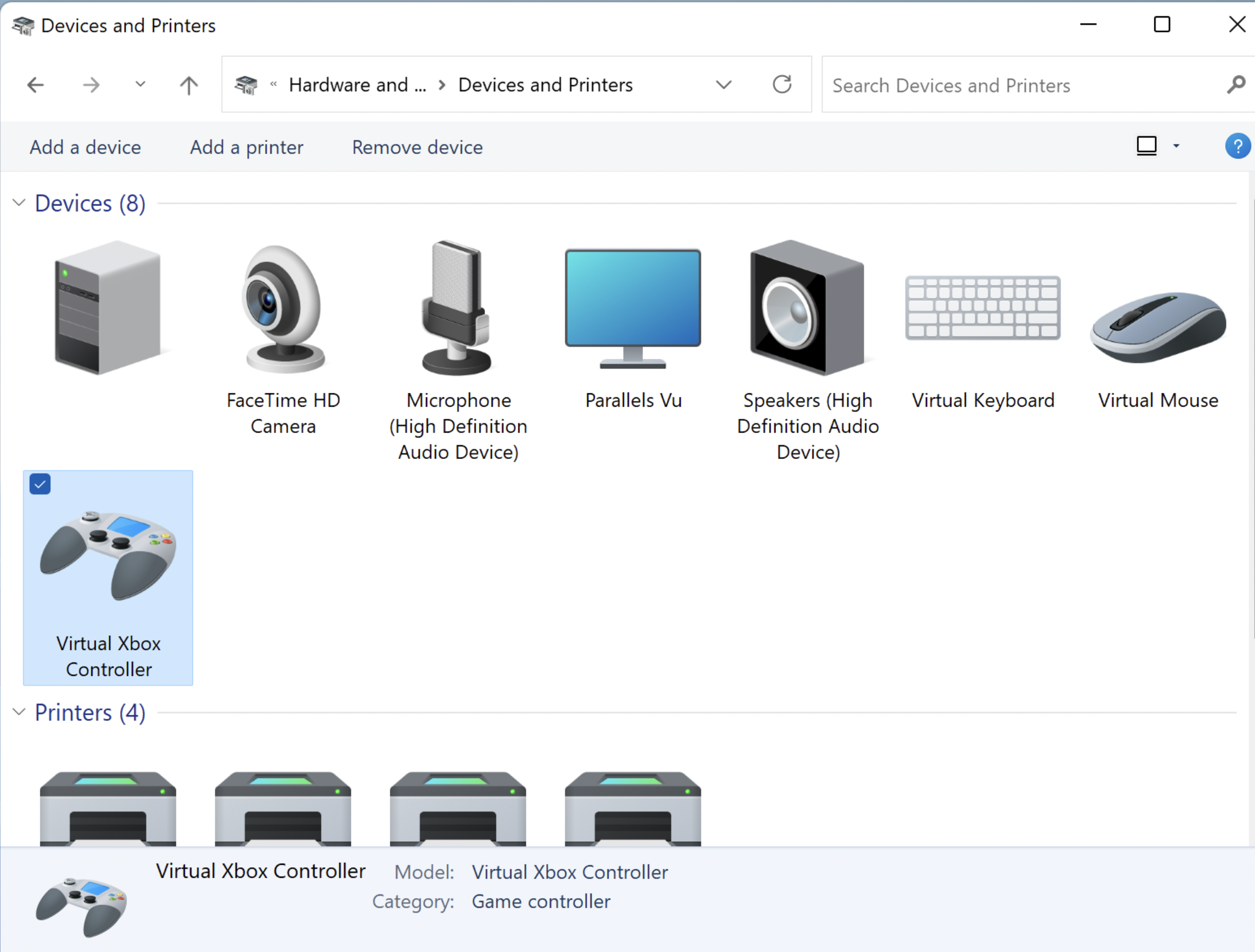 2. Чтобы убедиться, что устройство подключено к виртуальной машине, запустите Windows и в строке поиска Windows введите Панель управления. На панели управления выберите Устройства и принтеры. В списке должно быть искомое устройство Virtual Xbox Controller.