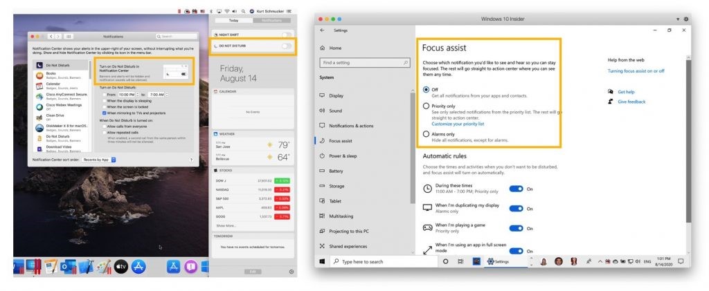 맥OS와 윈도우 OS에는 모두 방해금지 모드 설정이 있습니다. 윈도우에서는 이를 ‘집중 지원(Focus Assist)’이라고 합니다. (그림 1)