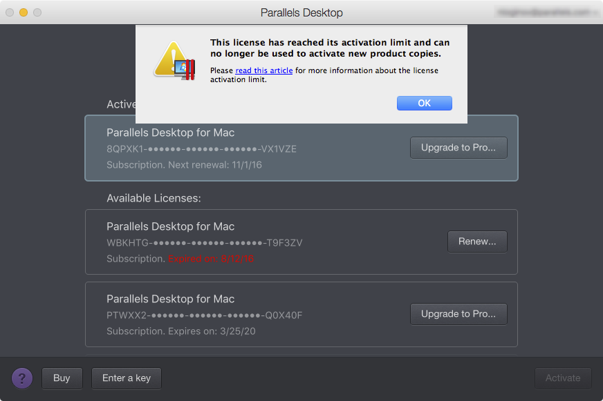 The license key was used to activate more than one copy of Parallels Desktop for Mac.