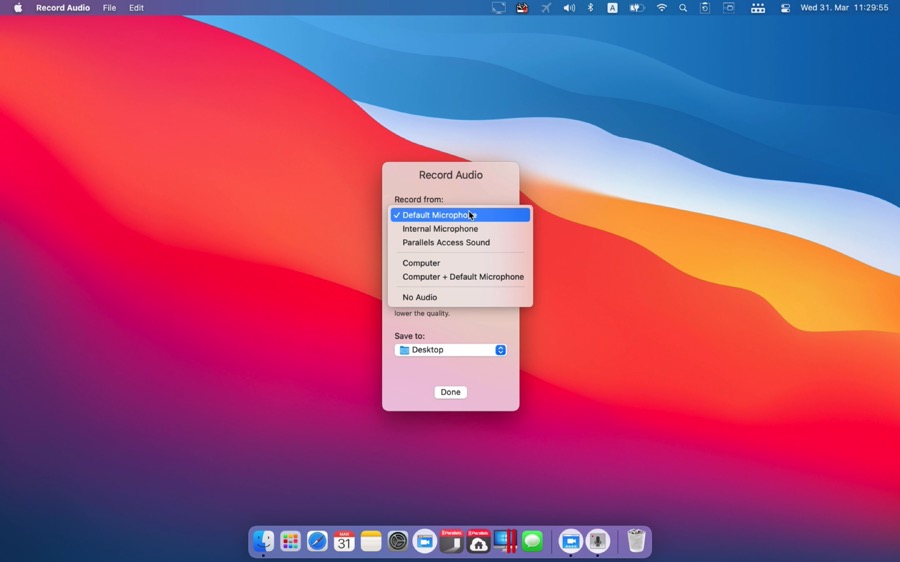 macOS och WindowsAnvänd datorns inbyggda mikrofon och spela in ljud med ett enda klick. Du kan spela in från en extern mikrofon om den är vald som ingångskälla i Systeminställningar › Ljud.