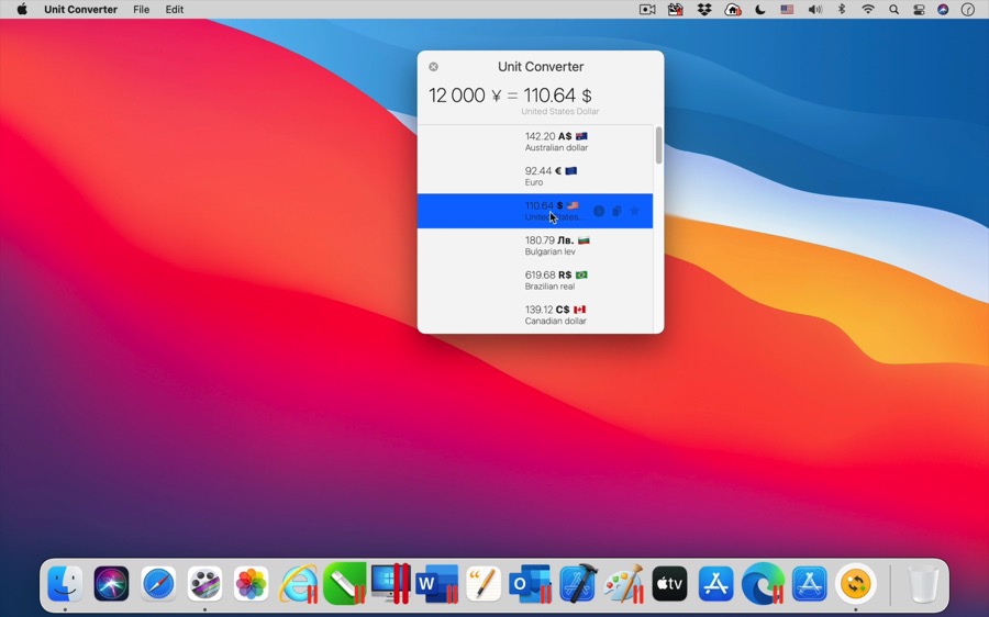 macOS och WindowsOmvandla enheter och valutor genom att enkelt mata in vad du vill omvandla. Du behöver inte välja en kategori – ange en siffra, och skriv sedan en eller flera bokstäver för att omedelbart se resultaten av omvandlingen. Till exempel, skriv bara ”73 F” och få temperaturen i Celsius.